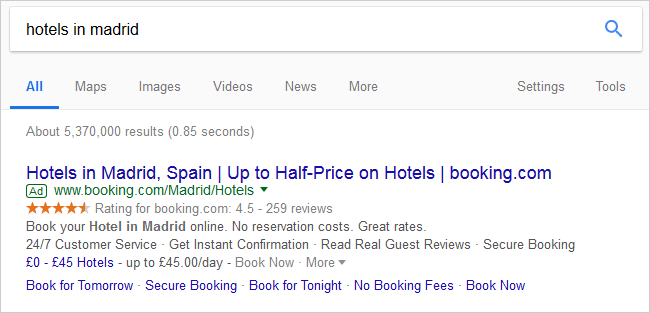 Customer, googling hotels in Madrid gets the perfect experience no matter which sitelink they click on. Landing on any pages puts them into the process of comparing accommodation options. I believe that Booking has sitelink conversion rate mush better than those 7-8%.